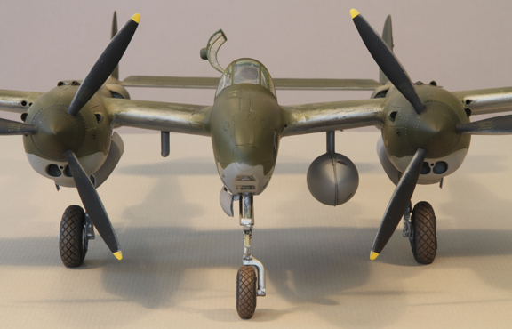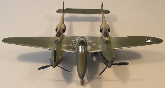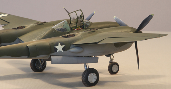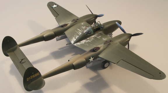 Accessories/modifications: This is a conversion from Trumpeter's excellent P-38L-1-LO kit to a F-5A-1-LO, a much earlier version of the Lightning, similar to a late P-38E or early P-38F. Added semicircular intercooler vents in upper wing tips and round intakes at wing leading edge (drilled out). Cut, modified, and drilled out kit turbo supercharger to fit P-38 EFG / F-5A style cowling. Modified kit turbocharger air supply scoop to P-38 EFG style (shorter, non-laminar flow shape). Drilled out and placed small tubular air ducts on forward sides of resin engine cowlings. Deleted and filled in leading edge wing lights. Deleted, filled and smoothed over upper wing tip fuel ports. Added retractable under wing lights (drilled out, scratch built, Alclad chrome, filled with ‘clear’, finished with Future). Removed underwing power assist bulges, filled and smoothed out. Removed gun camera from port drop tank boom, filled and smoothed out. Removed longitudinal frame from rear canopy, sanded and buffed out, Futured, then added two latitudinal scratches. Modified kit top canopy to side opening hinge-type. Made bulletproof glass (from CD case clear styrene), buffed and Futured, inserted under Cutting Edge windscreen. Four aluminum and steel spars for wing stiffness. Lead weight in engine cowlings and camera nose. Cutting Edge P-38 EFG conversion resin - windscreen, radiators, engine cowlings, turbo supercharger shrouds). Cutting Edge F-5A conversion resin – camera nose. Cutting Edge and Jerry Rutman P-38 EFG cockpit resin. Jerry Rutman props. Scale Aircraft Conversions white metal landing gear. Contact Resine tires. Thanks to John Clements for tips on details.