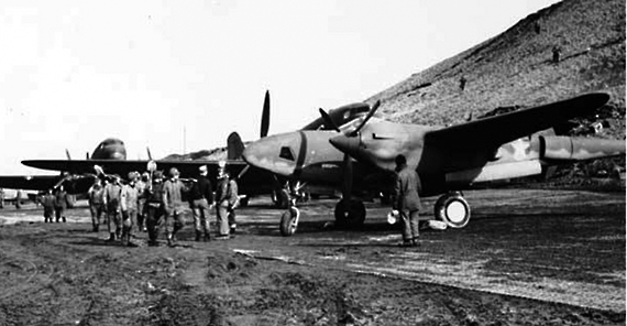 F-5A at Adak with C-47s, autumn 1942- note the neutral gray paintover of the lower dark blue part of the national mark on the port boom (and see above Adak image and model).