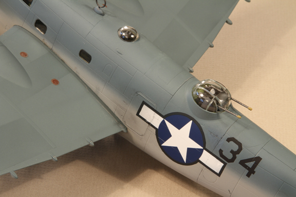 Accessories/modifications: Semicircular section of inner flap cut out for clearance of bomb-bay doors (correction). Added small radio direction finding antenna below nose. Ultracast covered resin wheels and tires (48233), Ultracast corrected resin exhausts (48234), Vector corrected resin propellors (VDS48-055), Vector resin corrected cowlings (VDS48-056), DMold corrected fuselage (DM48028). Eduard seatbelts (48365). Starboard fuselage window repositioned below national mark (see reference photo above). Kit tailwheel (very weak) reinforced with brass rod. Forgot to remove the masks from the underwing landing lights, the 3 formation lights and the bombardiers's window under the nose before taking these photos.