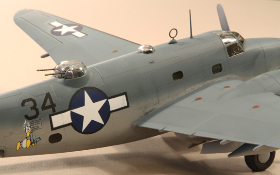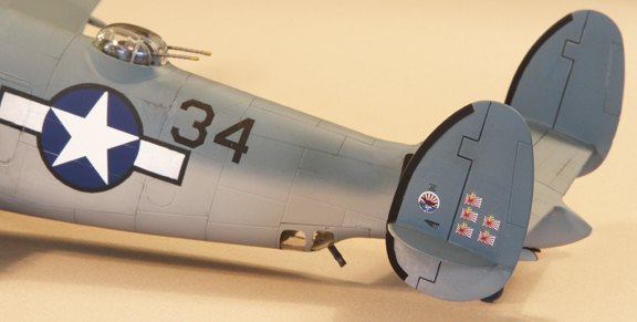Decals: kit decals except AeroMaster black 45º numbers (48802), starboard fuselage Donald Duck cartoon (Zotz ZTZ48009), fuselage national marks (Yellow Wings YW48048 - US National insignia PT-3 May 1942-June 1943 modified with paint to update to 1944 style) and painted over 'ghost' markings (Yellow Wings YW48048).